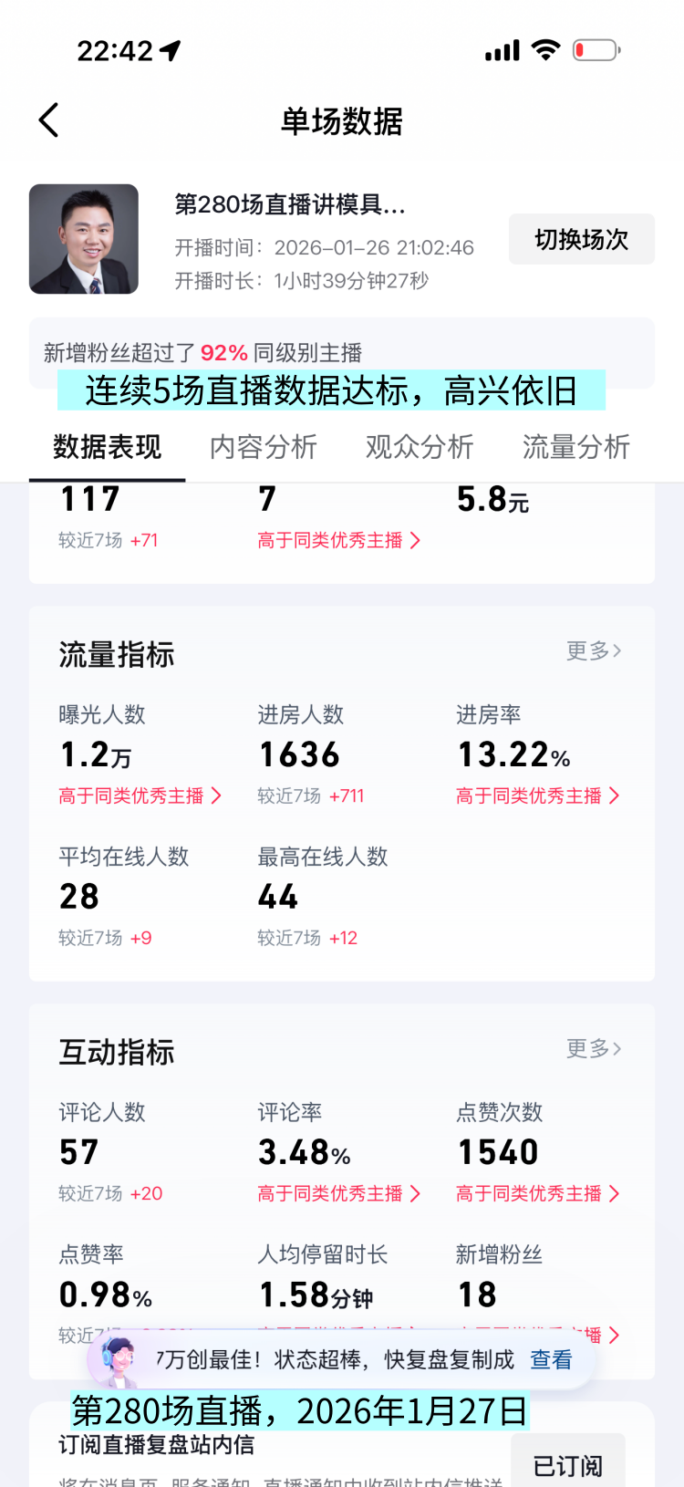 2026年1月26日星期日晚上,我做了1小时39分的直播,这是我的第280场直播。