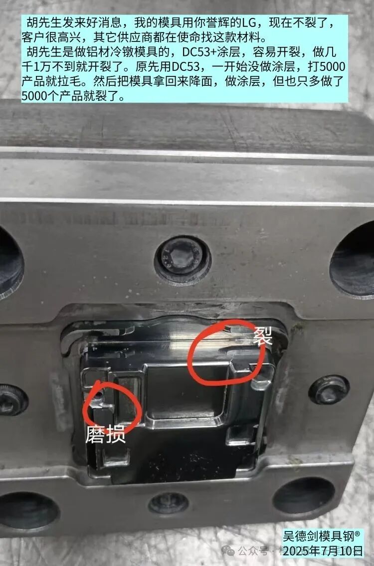 谭先生的铜铝复合冷锻压模具用H13时,容易变形,用DC53时,容易裂模,模具总是在开裂和塌模间摇摆不定。但模具用上高韧性的LG模具钢,寿命2万多次,寿命比H13,DC53长几倍。