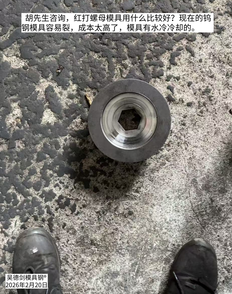 刚刚收到胡先生咨询,红打螺母模具用什么比较好?现在的钨钢模具容易裂,成本太高了,模具有水冷冷却的。