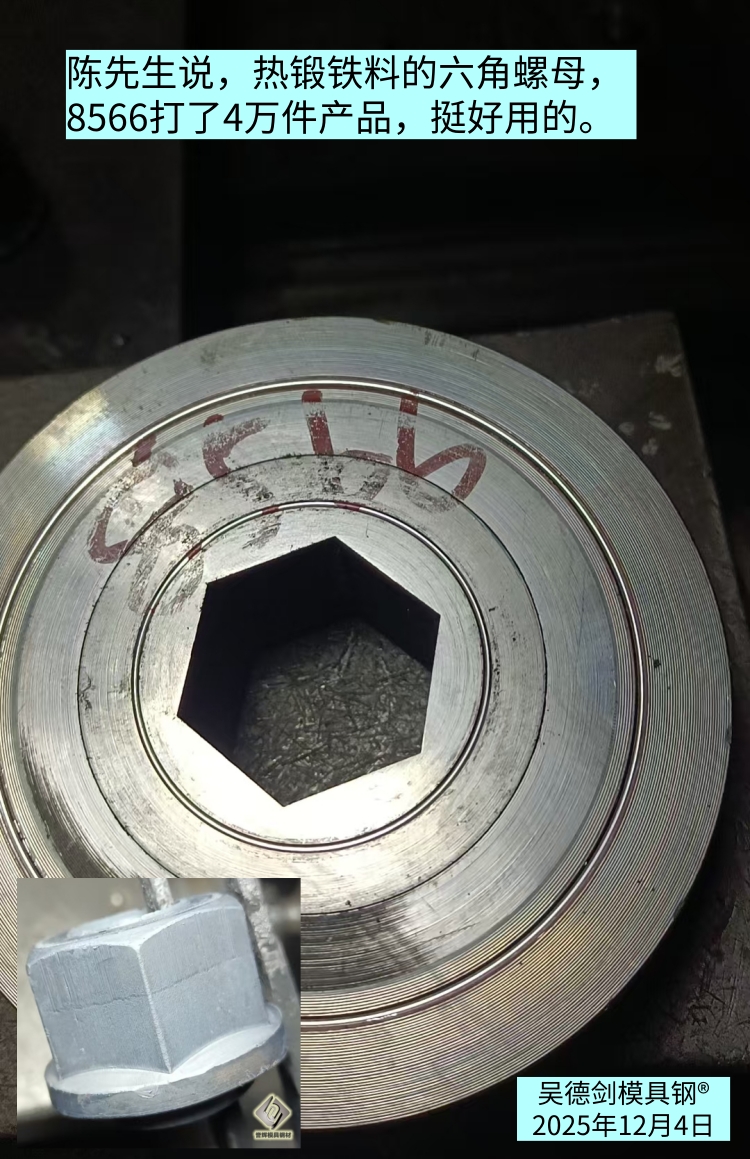 8566模具钢的耐热性能跟高速钢SKH51一样的耐烧,硬度HRC58-60,韧性是SKH51的4倍,8566模具钢把高耐热、高硬度、高韧性三者柔和得恰到好处,其它模具钢做不到这么高硬度,还能保持这么高的韧性。陈先生说,热锻铁料的六角螺母,8566打了4万件产品,挺好用的。